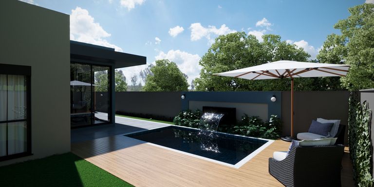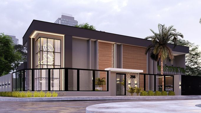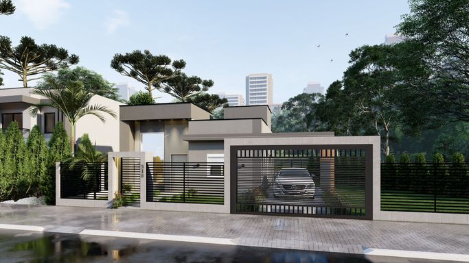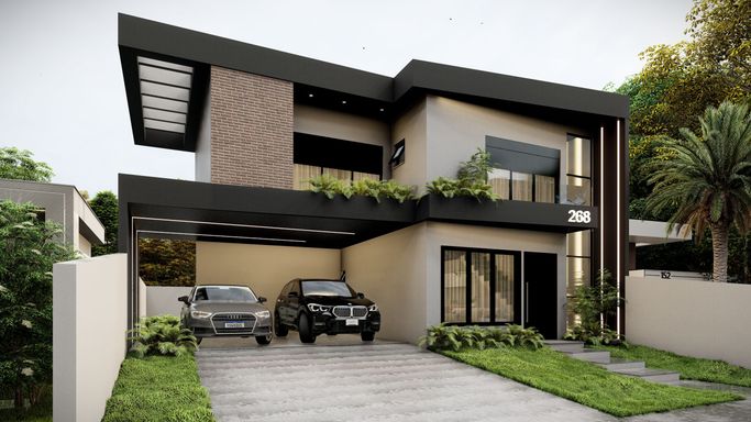 Living integrado com sala de estar , jantar e cozinha, com pé direito duplo na sala de estar, garagem para dois veículos, lavanderia, deposito, salão de festa com banheiro e home office . Possui também 2 suítes com closet e 1 suíte master com varanda e área de lazer com piscina e deck.
