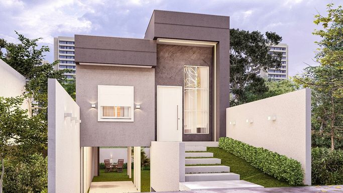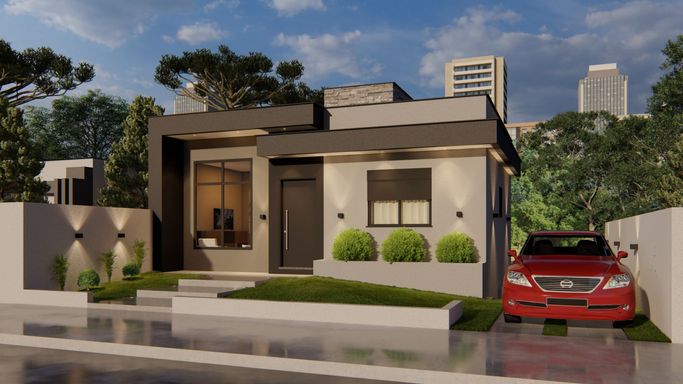 Living integrado com sala de estar, jantar e cozinha com lavanderia além de garagem para um veículo junto aos pilotis. Contando com banheiro social e 3 dormitórios, sendo 1 suíte. E na Segunda opção conta com banheiro social e 2 dormitórios, sendo 1 suíte.