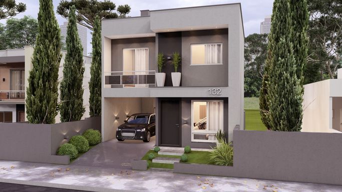 Living integrado com sala de estar, jantar e cozinha, um lavabo e lavanderia, além de garagem para dois veículos na parte do pavimento térreo. Já no pavimento Superior, a planta possui 3 suítes, sendo as da frente da casa com sacada.