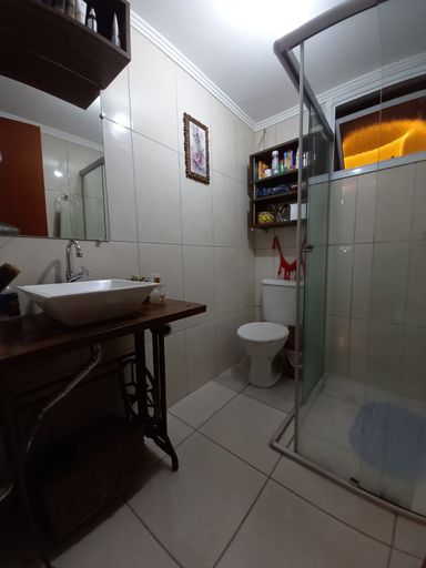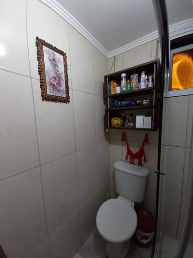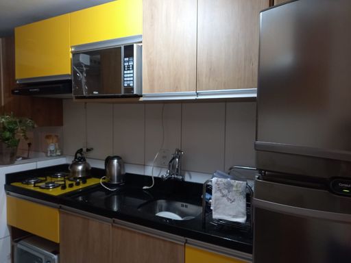 Apartamento com dois dormitórios, cozinha com móveis planejados, box no banheiro.
