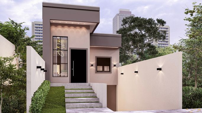 Na área social há living integrado com sala de estar com pé direito duplo, sala de jantar e cozinha, garagem para um veículo no subsolo. Já área íntima há o banheiro social, dois dormitórios.