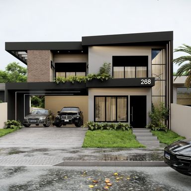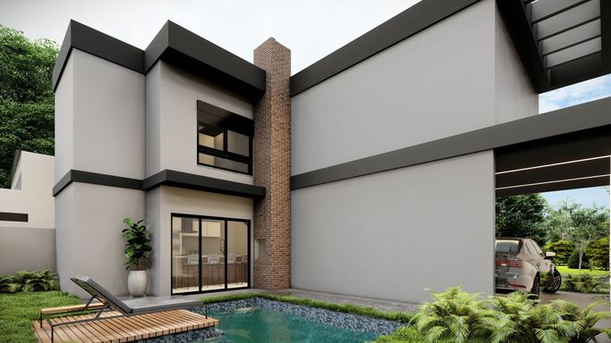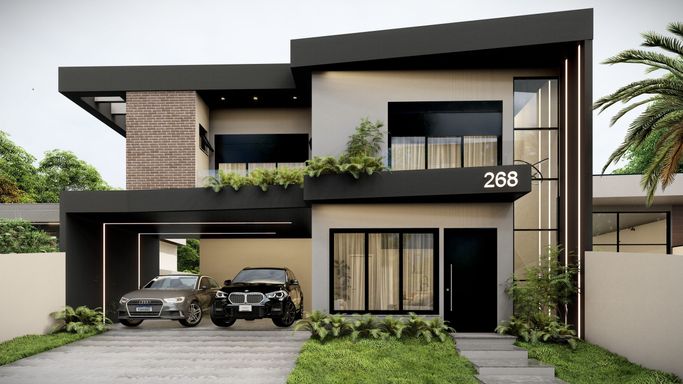 Living integrado com sala de estar, jantar e cozinha, um lavabo e lavanderia, além de garagem para dois veículos na parte do pavimento térreo. Já no pavimento Superior, a planta possui 3 suítes, sendo as da frente da casa com sacada.